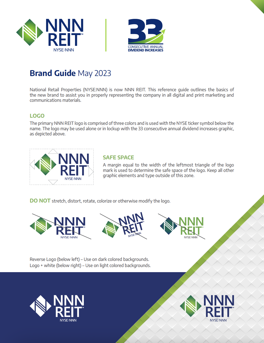 This document outlines the visual elements that make up NNN REIT's brand to assist you in properly representing the company in all design, marketing, and communications materials.