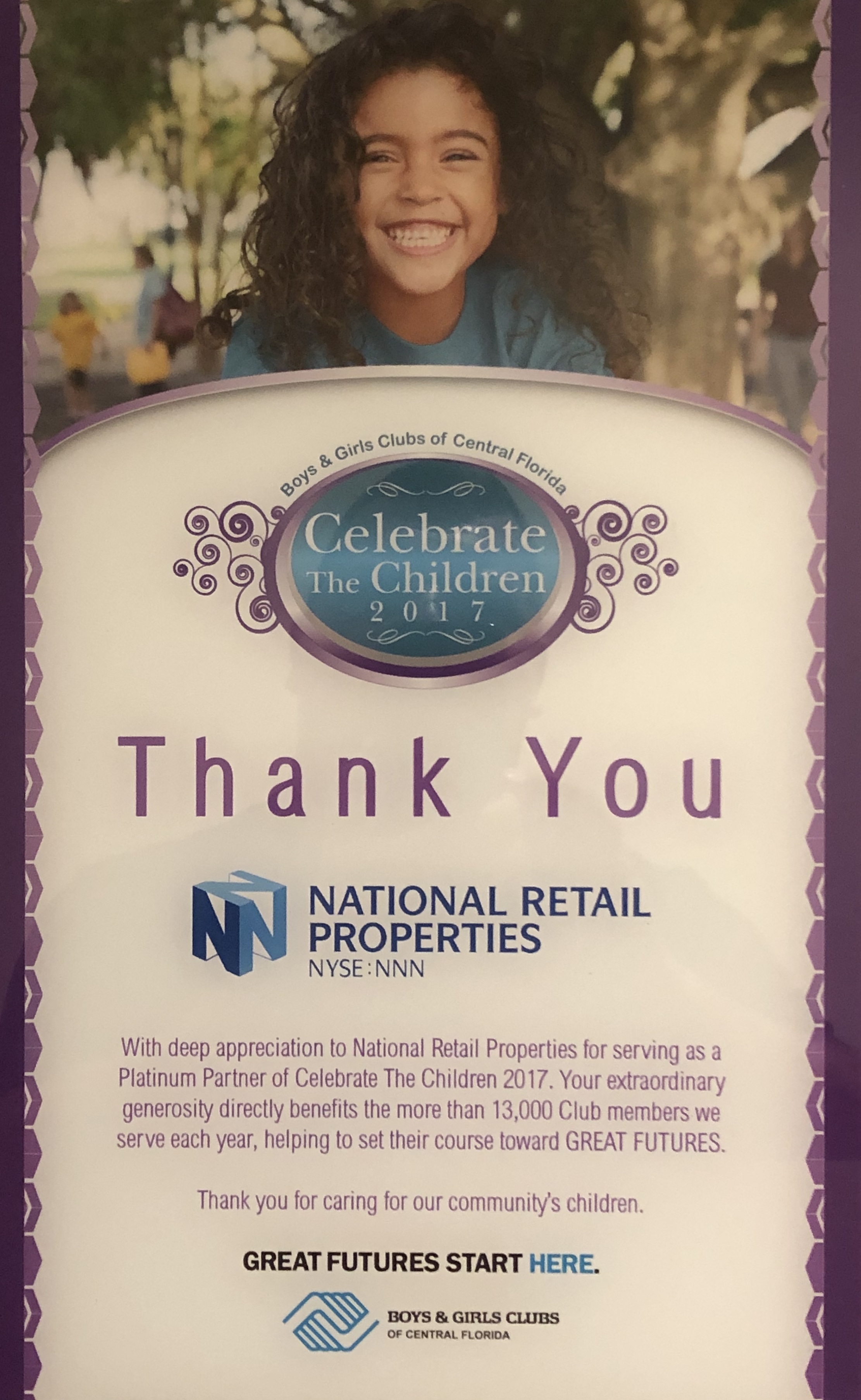 Give Kids The World is a non-profit organization that exists only to fulfill the wishes of children with life-threatening illnesses and their families from around the world to experience a memorable, joyful, cost-free visit to Central Florida attractions. NNN REIT associates volunteer at the GKTW village performing a variety of functions assisting these families during their stay.
